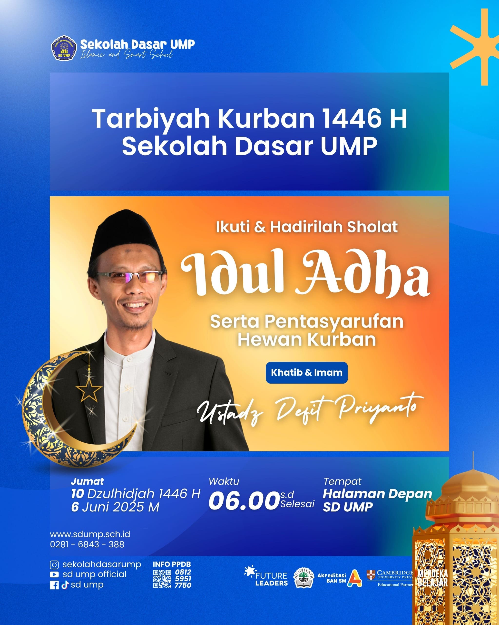 <p>🌟 Mari Rayakan Iduladha dengan Penuh Keberkahan! 🌟<p>SD UMP mengundang Ayah, Bunda, serta seluruh warga untuk bersama-sama menunaikan Salat Idul Adha dan mengikuti pentasyarufan hewan kurban sebagai bentuk syukur. 🕌🐄</p><p>📅 Jumat, 10 Dzulhijjah 1446 H<br>🗓️ 6 Juni 2024<br>🕕 Pukul 06.00 WIB (Hadir Tepat Waktu)<br>📍 Halaman Depan SD UMP</p><p>🕌 Khotib & Imam:<br>Ustadz Defit Priyanto<br>Tema : Mutiara hikmah dibulan Dzulhijjah</p><p>Mari hadir bersama keluarga untuk menghidupkan syiar Islam dan menebar keberkahan kurban.<br>Terbuka untuk umum – semua kalangan dipersilakan hadir.</p><p>#IdulAdha1446H #SholatId #KurbanBerkah #SDUMP #UMPBerbagi #LebaranQurban</p></p>