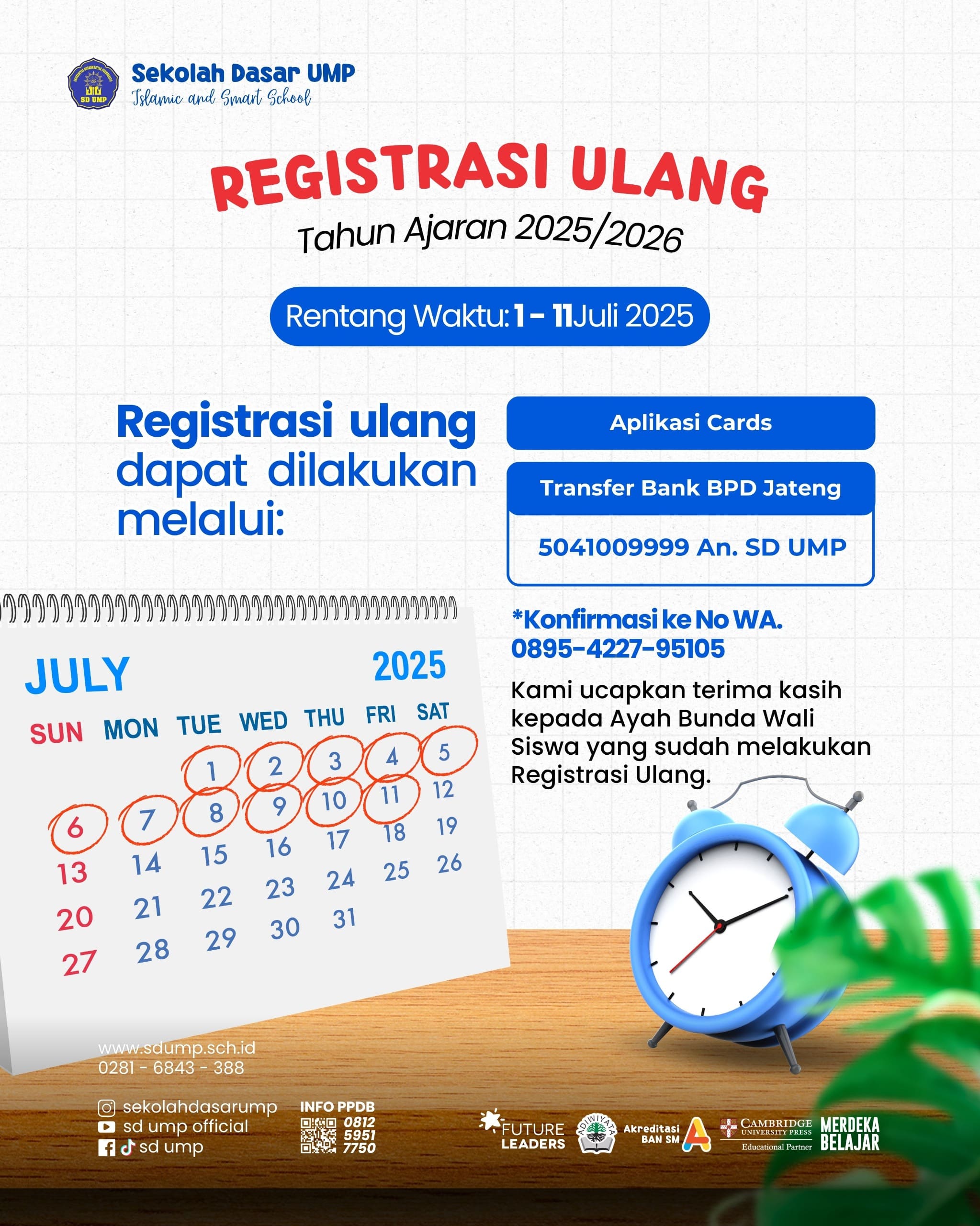 <p>Reminder<br>REGISTRASI ULANG Tahun Ajaran 2025/2026<br>🗓️ 1–11 Juli 2025<p>Registrasi ulang dapat dilakukan melalui aplikasi CARDS 📲<br>Pembayaran bisa melalui aplikasi CARDS atau transfer ke:<br>🏦 Bank Jateng<br>🔢 No. Rek: 5041009999 a.n. SD UMP</p><p>Konfirmasi pembayaran: WA 0895422795105 (Admin Keuangan)</p><p>Terima kasih kepada Ayah Bunda yang telah melakukan registrasi ulang . Semoga Allah SWT memberikan kelapangan rezeki, keberkahan dalam setiap langkah, serta kesehatan dan kebahagiaan untuk seluruh Ayah Bunda sekeluarga.</p></p>